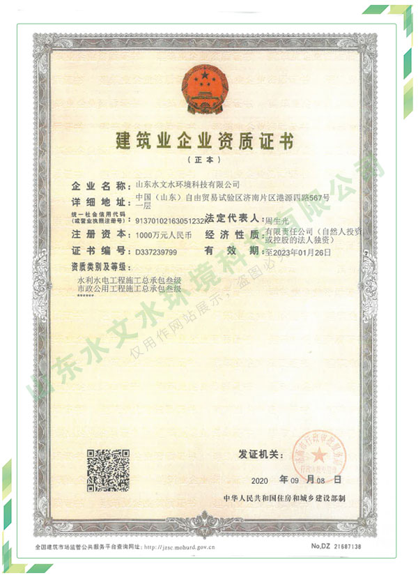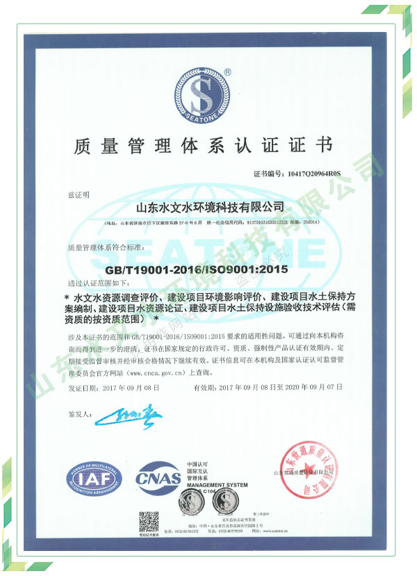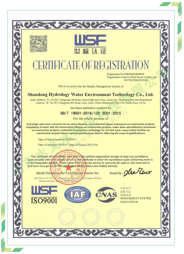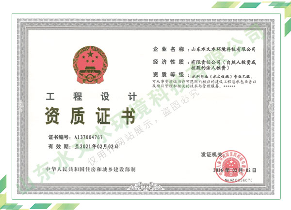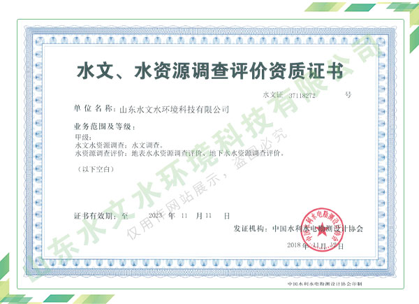 公司擁有水利工程設(shè)計(jì)、水土保持、水文水資源調(diào)查評(píng)價(jià)、水資源論證、建設(shè)項(xiàng)目環(huán)境影響評(píng)價(jià)、市政公用工程施工總承包、水利水電工程施工總承包、電子與智能化工程專業(yè)承包等資質(zhì),2017年通過(guò)質(zhì)量管理體系、環(huán)境管理體系、職業(yè)健康安全管理體系認(rèn)證;2020年被評(píng)為國(guó)家級(jí)高新技術(shù)企業(yè),同年被中國(guó)水利企業(yè)協(xié)會(huì)推薦為第一批“合同節(jié)水服務(wù)企業(yè)”;2021年被山東省、濟(jì)南市評(píng)為 “專精特新”中小企業(yè)。業(yè)務(wù)范圍涉及水利工程設(shè)計(jì);節(jié)水設(shè)計(jì)、改造、水平衡測(cè)試;山洪災(zāi)害調(diào)查;城市水資源調(diào)查評(píng)價(jià);建設(shè)項(xiàng)目水土保持方案編制、監(jiān)測(cè)、驗(yàn)收、水土保持規(guī)劃;水安全保障規(guī)劃、建設(shè)項(xiàng)目水資源論證、規(guī)劃水資源論證;建設(shè)項(xiàng)目環(huán)境影響評(píng)價(jià);入河排污口論證;防洪影響評(píng)價(jià);市政公用工程施工、水利水電工程施工、電子與智能化工程施工等。